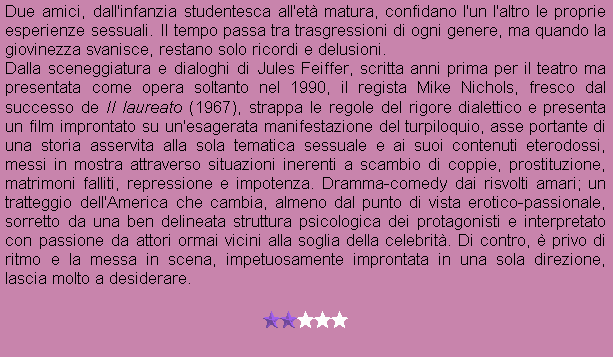 Regia: Mike Nichols Cast: Jack Nicholson, Candice Bergen, Ann-Margret, Art Garfunkel, Rita Moreno, Cynthia O'Neal, Carol Kane Sceneggiatura: Jules Feiffer Fotografia: Giuseppe Rotunno Musica: Dan Wallin (Orchestrazione) |