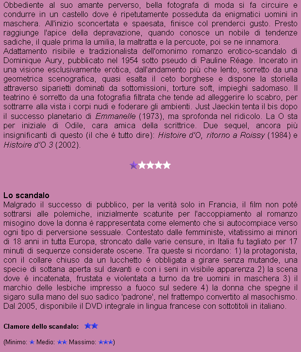Titolo originale: Histoire d'O Anno: 1975 Nazionalità: FRA - GER O - CAN Produzione: Somerville House/A.D. Creation/S.N. Prodis/YF/Filmkunst Genere: Drammatico Durata: 1 ora e 35 minuti (Durata origin.: 1 ora e 53 minuti) Divieto: Minori di 18 anni |