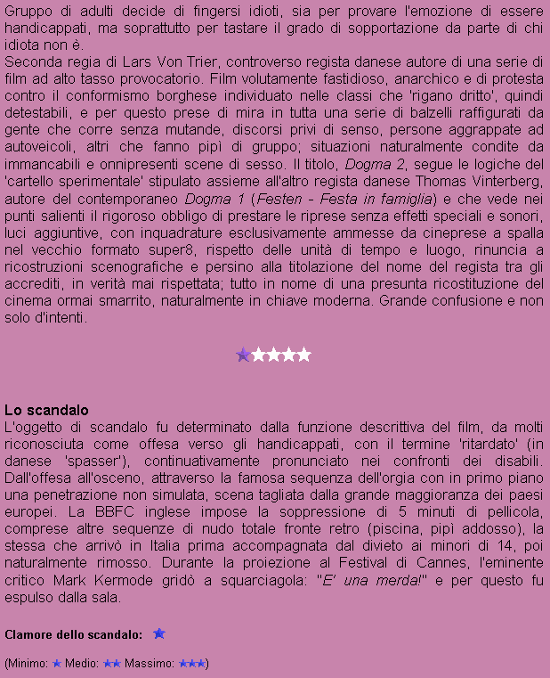 Titolo originale: Dogme 2 - Idioterne Anno: 1998 Nazionalità: DAN Produzione: Zentropa Entertainments/DR/Arte/ZDF Genere: Commedia Durata: 1 ora e 52 minuti (Durata orig.: 1 ora e 57 minuti) Divieto: Film per tutti (Divieto iniziale: minori di 14 anni) Premi: Festival di Cannes (Lars Von Trier: nomination alla Palma d'Oro) |