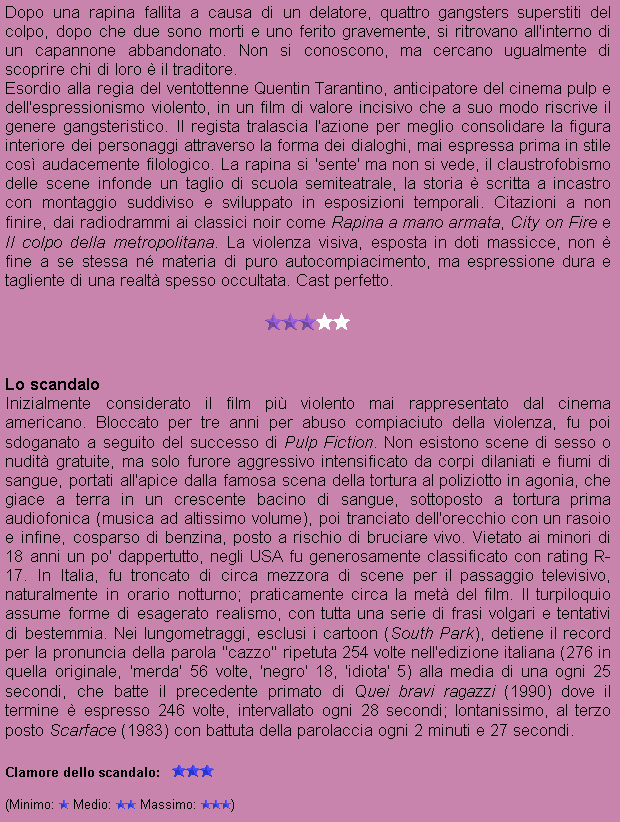 Regia: Quentin Tarantino Cast: Harvey Keitel, Tim Roth, Michael Madsen, Chris Penn, Steve Buscemi, Lawrence Tierney, Kirk Baltz Sceneggiatura: Quentin Tarantino, Roger Avary Fotografia: Andrzej Sekula Musica: Artisti vari |