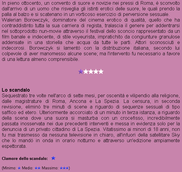 Titolo originale: Interno di un convento (Tit. tedesco: Unmoralische Novizzinen) Anno: 1978 Nazionalità: ITA - GER Produzione: Lisa-Film/Trust International Films Genere: Drammatico Durata: 1 ora e 35 minuti (Durata orig.: 1 ora e 39 minuti) Divieto: Minori di 18 anni |