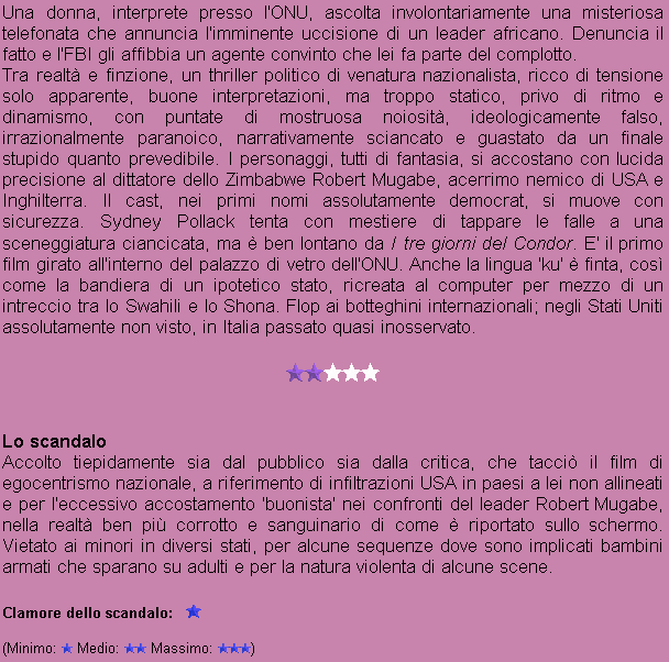 Regia: Sydney Pollack Cast: Nicole Kidman, Sean Penn, Catherine Keener, Jesper Christensen, Yvan Attal, Earl Cameron, Sydney Pollack, George Harris, Michael Wright, Clyde Kusatsu Sceneggiatura: Charles Randolph, Scott Frank, Steven Zaillian (dal soggetto di Martin Stellman e Brian Ward) Fotografia: Darius Khondji Dreville Musica: James Newton Howard |