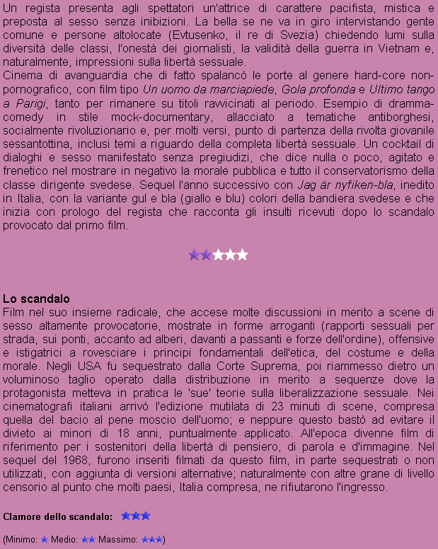 Titolo originale: Jag är nyfiken-gul Anno: 1967 Nazionalità: SVE Produzione: Sandrews Genere: Drammatico Durata: 1 ora e 38 minuti (Durata orig.: 2 ore e 1 minuto) Divieto: Minori di 18 anni |