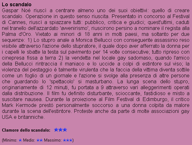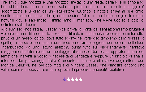 Regia: Gaspar Noé Cast: Monica Bellucci, Vincent Cassel, Albert Dupontel, Jo Prestia, Philippe Nahon, Stéphane Drouot, Jean-Louis Costes, Michel Gondoin, Mourad Khima Sceneggiatura: Gaspar Noé Fotografia: Gaspar Noé, Benoît Debie Musica: Thomas Bangalter |