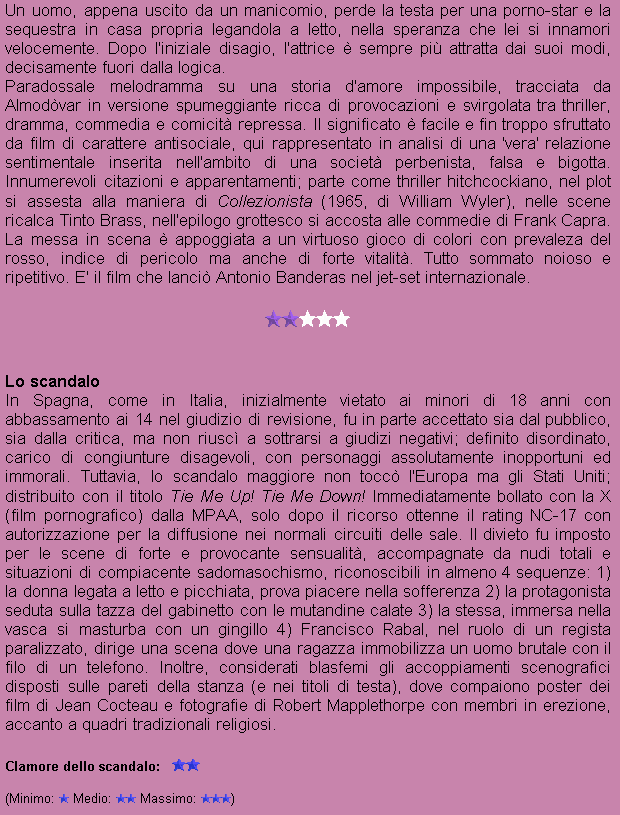 Titolo originale: ”Átame! Anno: 1990 Nazionalitą: SPA Produzione: El Deseo S.A. Genere: Commedia Durata: 1 ora e 51 minuti Divieto: Minori di 14 anni (Divieto iniziale: minori di 18 anni) Premi: Festival di Berlino (GER) (Pedro Almodóvar: nomination all'Orso d'Oro) César (FRA) (Nomination miglior film straniero) |