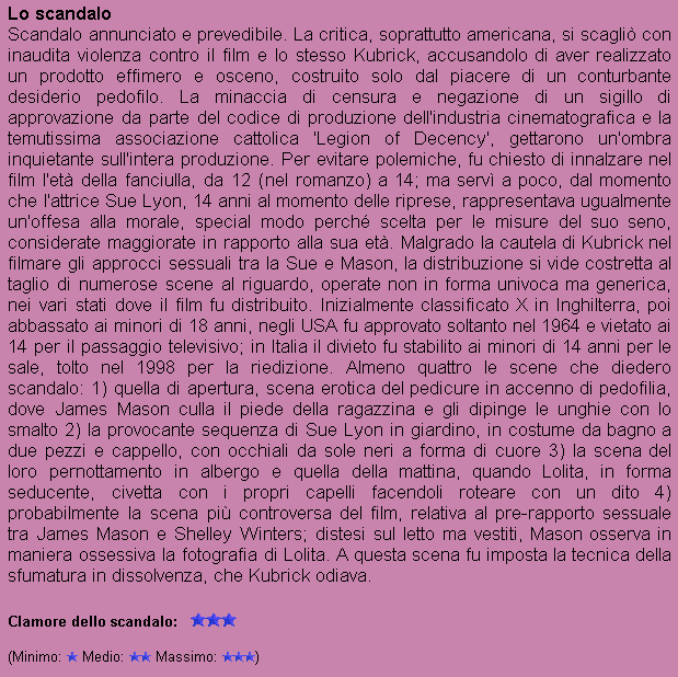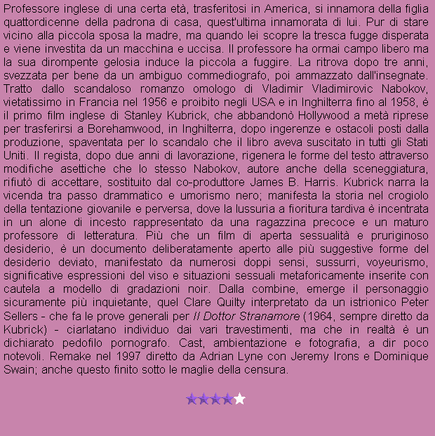 Titolo originale: Lolita Anno: 1962 Nazionalità: ING - USA Produzione: Metro-Goldwyn-Mayer/Transworld Pictures Genere: Drammatico Durata: 2 ore e 32 minuti Divieto: Minori di 14 anni Premi: Nomination all'Oscar (Sceneggiatura) Festival di Venezia (Stanley Kubrick: nomination al Leone d'Oro) Bafta (ING) (James Mason: nomination miglior attore) Golden Globes (USA) (Nomination: Regia - James Mason - Shelley Winters - Peter Sellers) |