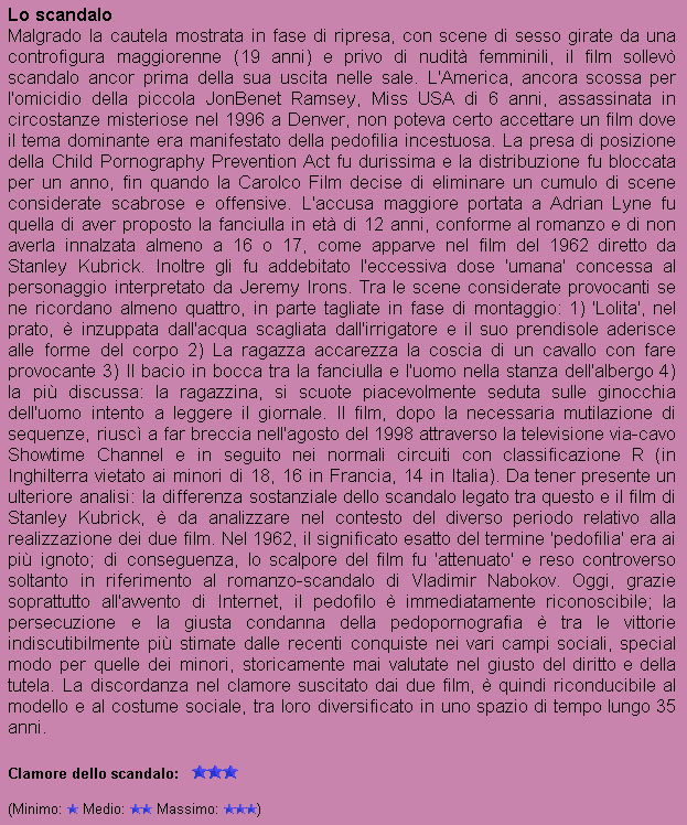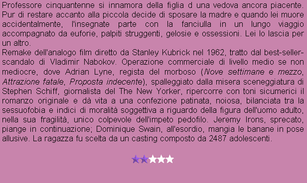 Regia: Adrian Lyne Cast: Jeremy Irons, Melanie Griffith, Frank Langella, Dominique Swain, Suzanne Shepherd, Keith Reddin Sceneggiatura: Stephen Schiff (dal romanzo di Vladimir Nabokov) Fotografia: Howard Atherton Musica: Ennio Morricone |