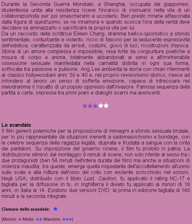 Titolo originale: Se, jie Anno: 2007 Nazionalità: USA - CINA - TAIWAN - HONK KONG Produzione: River Road /Hai Sheng Film/Focus/Haishang Films Genere: Drammatico Durata: 2 ore e 28 minuti (Duurata orig.: 2 ore e 37 minuti) Divieto: Minori di 14 anni Premi: Festival di Venezia (Ang Lee: Leone d'Oro - Fotografia: Premio Osella) Nastro d'Argento (Nomination miglior film extraeuropeo) Gloden Globes (USA) (Nomination miglior film straniero) Bafta (ING) (Nomination sceneggiatura e costumi) |