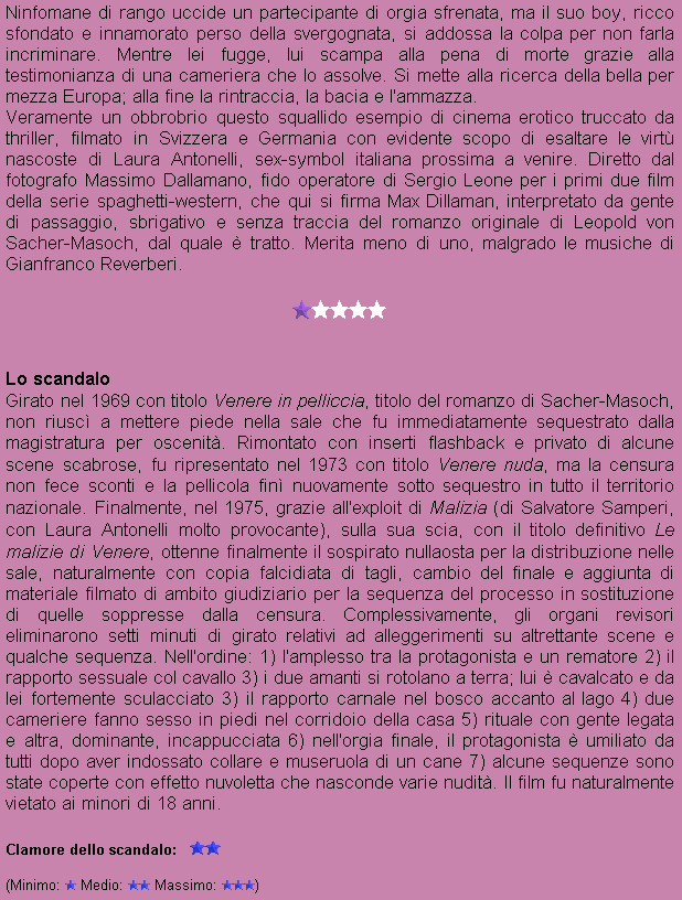 Regia: Massimo Dallamano Cast: Laura Antonelli, Régis Vallée, Wolf Ackva, Rex Duvel, Peter Heeg, Renate Kasche, Ewing Loren, Werner Pochats, Mady Rahl Sceneggiatura: Inge Hilger, Fabio Massimo (dal romanzo di Leopold von Sacher-Masoch) Fotografia: Sergio D'Offizi Musica: Gianfranco Reverberi |