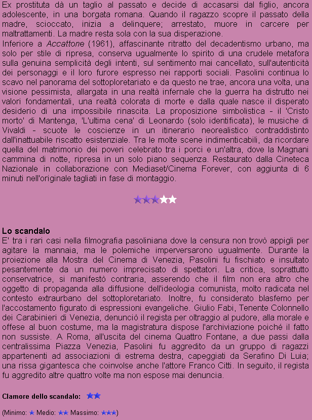 Regia: Pier Paolo Pasolini Cast: Anna Magnani, Ettore Garofolo, Franco Citti, Silvana Corsini, Luisa Loiano, Paolo Volponi, Luciano Gonini Sceneggiatura: Pier Paolo Pasolini Fotografia: Tonino Delli Colli Musica: Da opere di Antonio Vivaldi - Arrangiamento di Carlo Rustichelli |