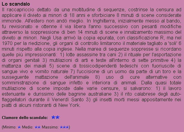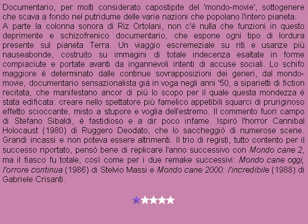 Regia: Gualtiero Jacopetti, Franco Prosperi e Paolo Cavara Cast: Rossano Brazzi, Paolo Cavara, Franco Prosperi Sceneggiatura: Gualtiero Jacopetti, Paolo Cavara Fotografia: Antonio Climati, Benito Frattari Musica: Riz Ortolani |