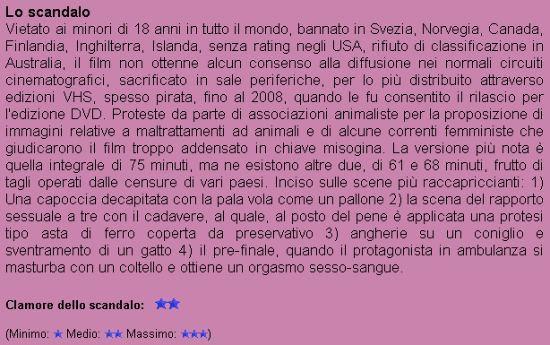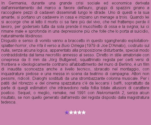 Titolo originale: Nekromantik Anno: 1987 Nazionalità: GER Produzione: Jelinski Produktion Genere: Horror Durata: 1 ora e 11 minuti - 1 ora e 8 minuti (Durata originale.: 1 ora e 15 minuti) Divieto: Minori di 18 anni |