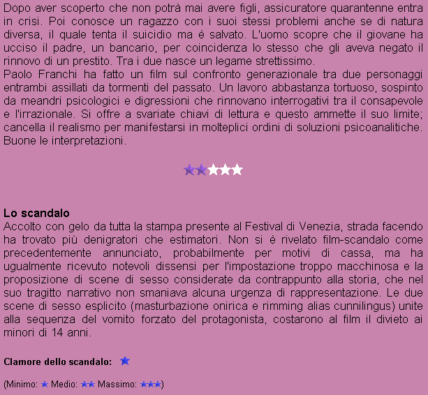 Regia: Paolo Franchi Cast: Bruno Todeschini, Elio Germano, Irène Jacob, Maria de Medeiros, Paolo Graziosi, Mimosa Campironi, Alexandra Stewart, Rinaldo Rocco Sceneggiatura: Paolo Franchi, Daniela Ceselli, Michele Pellegrini Fotografia: Martin Wheeler Musica: Cesare Accetta |