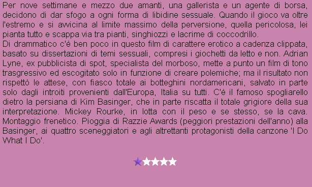 Regia: Adrian Lyne Cast: Mickey Rourke, Kim Basinger, Kim Chan, Karen Young, Margaret Whitton, Christine Baranski, David Margulies Sceneggiatura: Sarah Kernochan, Zalman King, Patricia Louisianna Knop, Elizabeth McNeill Fotografia: Peter Biziou Musica: Jack Nitzsche |