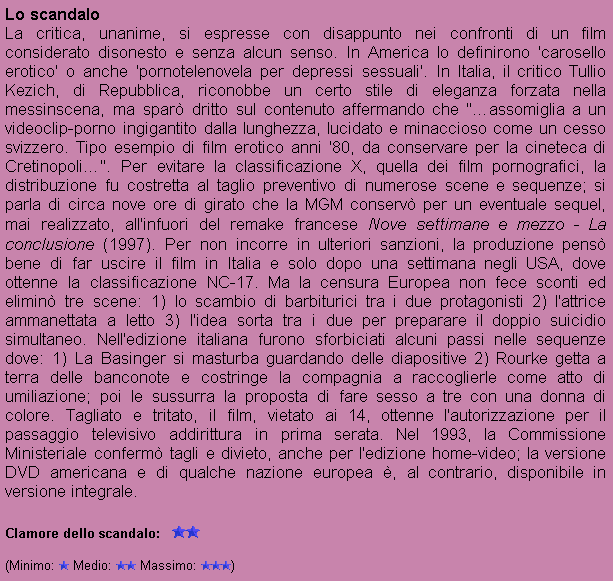 Titolo originale: 9½ Weeks (anche Nine ½ Weeks) Anno: 1986 Nazionalità: USA Produzione: Metro-Goldwyn-Mayer/Galactic/Sales/Jonesfilm Genere: Drammatico Durata: 1 ora e 52 minuti (Durata orig.: 2 ore e 1 minuto) Divieto: Minori di 14 anni |