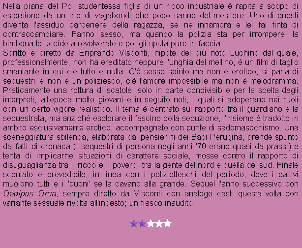 Regia: Eriprando Visconti Cast: Michele Placido, Flavio Bucci, Rena Niehaus, Bruno Corazzari, Gabriele Ferzetti, Flavio Bucci, Miguel Bosé, Vittorio Mezzogiorno Sceneggiatura: Eriprando Visconti, Roberto Gandus, Lisa Morpurgo (dal soggetto di Eriprando Visconti) Fotografia: Blasco Giurato Musica: Jules Dashow, Federico Monti Arduini |