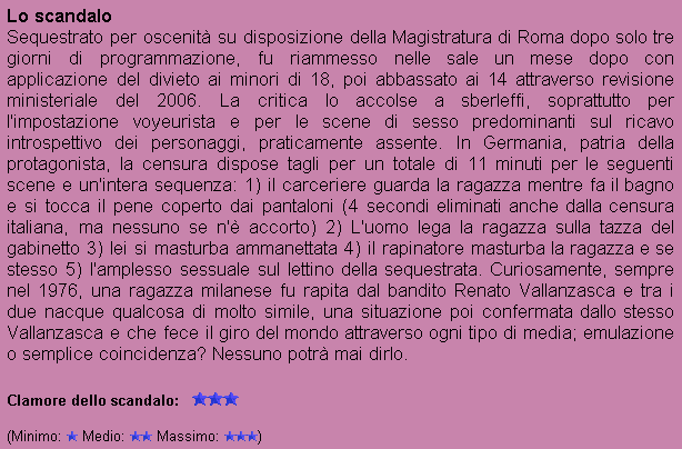 Titolo originale: La orca Anno: 1976 Nazionalità: ITA Produzione: Serena Film '75 Genere: Drammatico Durata: 1 ora e 45 minuti Divieto: Minori di 14 anni (Divieto iniz.: minori di 18 anni) |