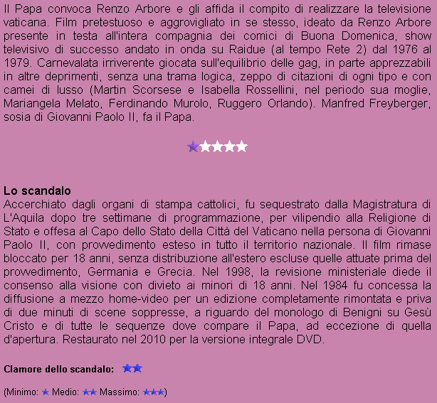 Titolo originale: Il pap'occhio (anche Il papocchio) Anno: 1980 Nazionalità: ITA Produzione: Rai/Eidoscope S.r.l. Genere: Commedia Durata: 1 ora e 48 minuti (Durata orig.: 1 ora e 50 minuti) Divieto: Minori di 18 anni |