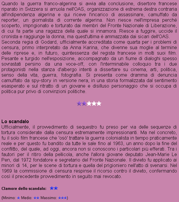 Titolo originale: Le petit soldat Anno: 1960 Nazionalità: FRA Produzione: SNC Genere: Drammatico Durata: 1 ora e 28 minuti Divieto: Minori di 14 anni |