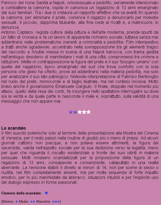 Regia: Antonio Capuano Cast: Fabrizio Bentivoglio, Emanuele Gargiulo, Rosaria De Cicco, Teresa Saponangelo, Tonino Taiuti Sceneggiatura: Antonio Capuano Fotografia: Antonio Baldoni Musica: Umberto Guarino, Almamegretta |