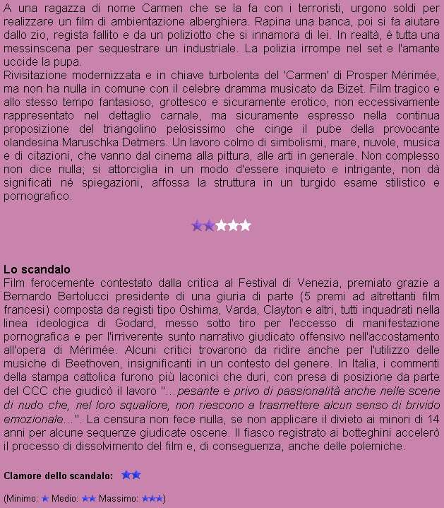 Titolo originale: Prénom Carmen Anno: 1983 Nazionalitą: FRA Produzione: JLG Films/Sara Films/Films A2 Genere: Drammatico Durata: 1 ora e 25 minuti Divieto: Minori di 14 anni Premi: Mostra del Cinema di Venezia (Jean-Luc Godard: Leone d'Oro - Fotografia e Suono: Premio Speciale della Giuria) |