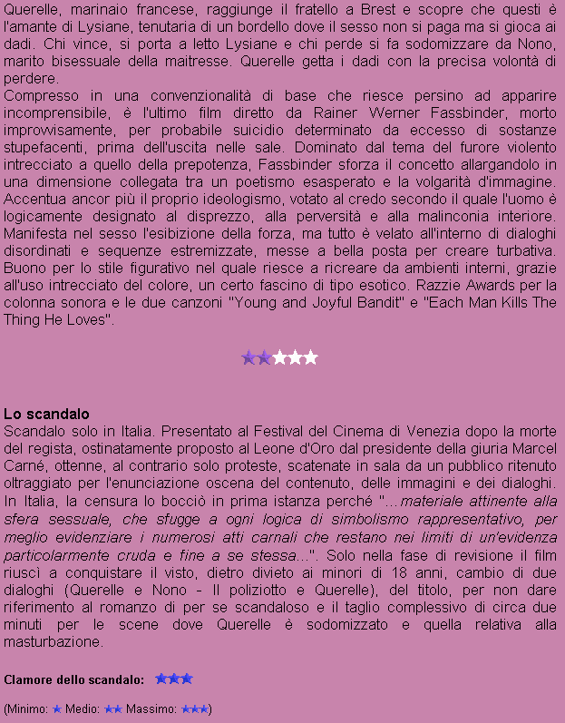 Titolo originale: Querelle Anno: 1982 Nazionalità: GER - FRA Produzione: Albatros Filmproduktion/Planet/Gaumont Genere: Drammatico Durata: 1 ora e 46 minuti (Durata orig.: 1 ora e 48 minuti) Divieto: Minori di 18 anni |