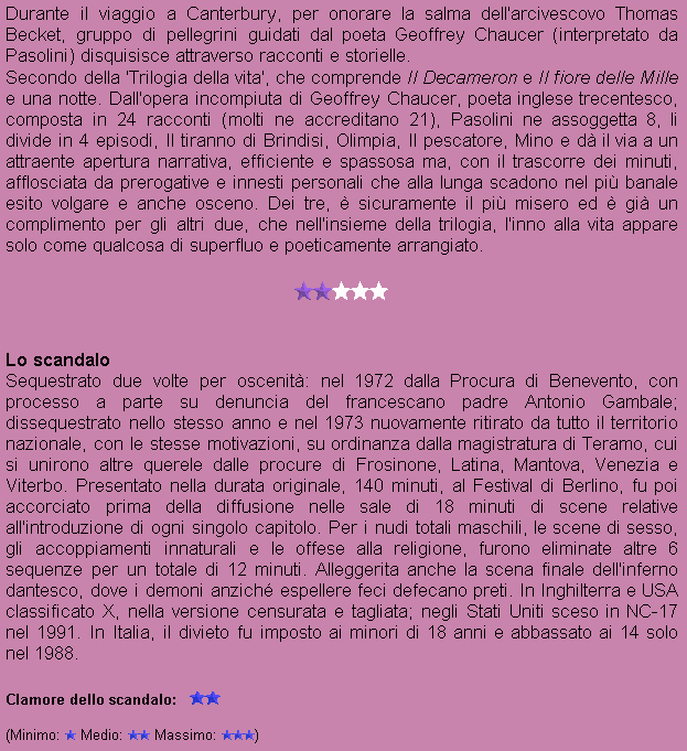 Regia: Pier Paolo Pasolini Cast: Hugh Griffith, Laura Betti, Ninetto Davoli, Franco Citti, Alan Webb, Josephine Chaplin, Pier Paolo Pasolini Sceneggiatura: Pier Paolo Pasolini (dalle novelle di Geoffrey Chaucer) Fotografia: Tonino Delli Colli Musica: Ennio Morricone |