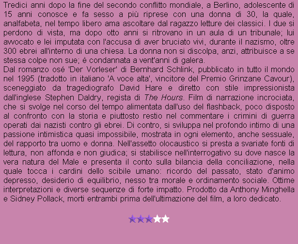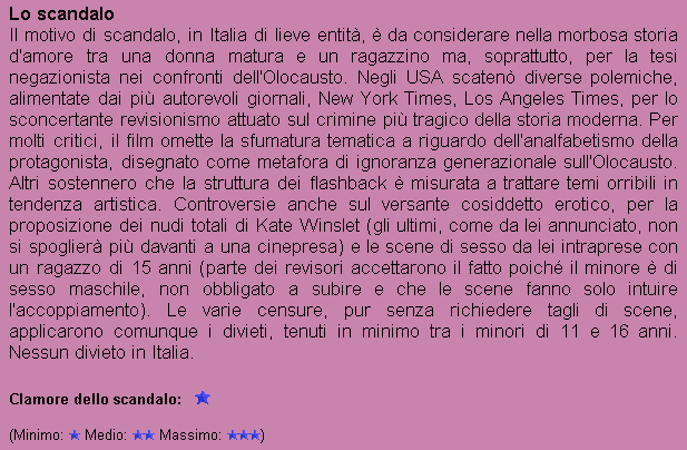 Titolo originale: The Reader Anno: 2008 Nazionalità: GER - USA Produzione: Weinstein Company/Mirage/Neunte Genere: Drammatico Durata: 2 ore e 4 minuti Divieto: Film per tutti Premi: Premio Oscar (Attrice: Kate Winslet) Nomination all'Oscar (Film - Regia - Sceneggiatura - Fotografia) David di Donatello (David per il Miglior Film dell'Unione Europea) |