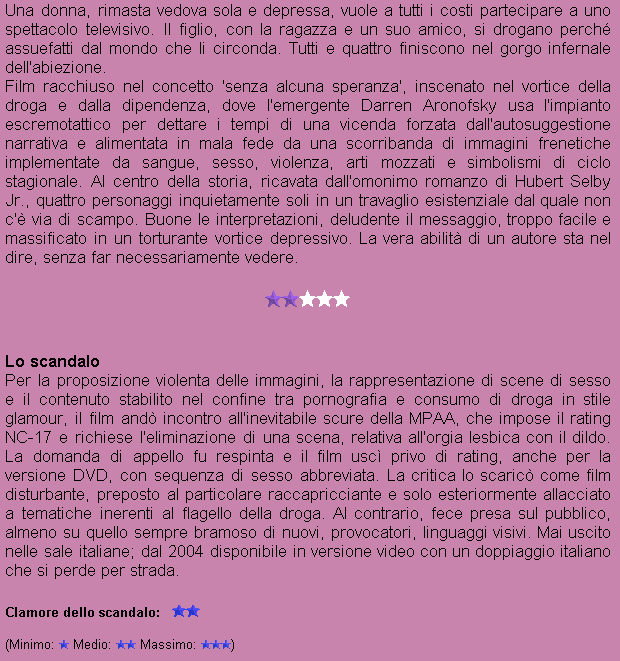Regia: Darren Aronofsky Cast: Ellen Burstyn, Jared Leto, Jennifer Connelly, Marlon Wayans, Jack O'Connell, Christopher McDonald Sceneggiatura: Darren Aronofsky, Hubert Selby Jr. (dal romanzo di Hubert Selby Jr.) Fotografia: Matthew Libatique Musica: Clint Mansell |