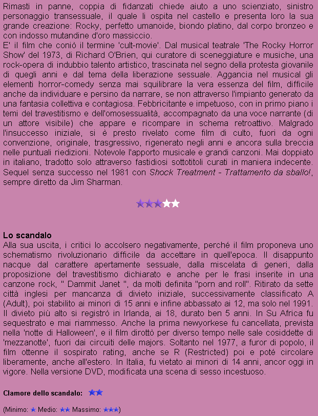 Titolo originale: The Rocky Horror Picture Show Anno: 1975 Nazionalità: USA - ING Produzione: 20th Fox Genere: Musical Durata: 1 ora e 40 minuti Divieto: Minori di 14 anni |