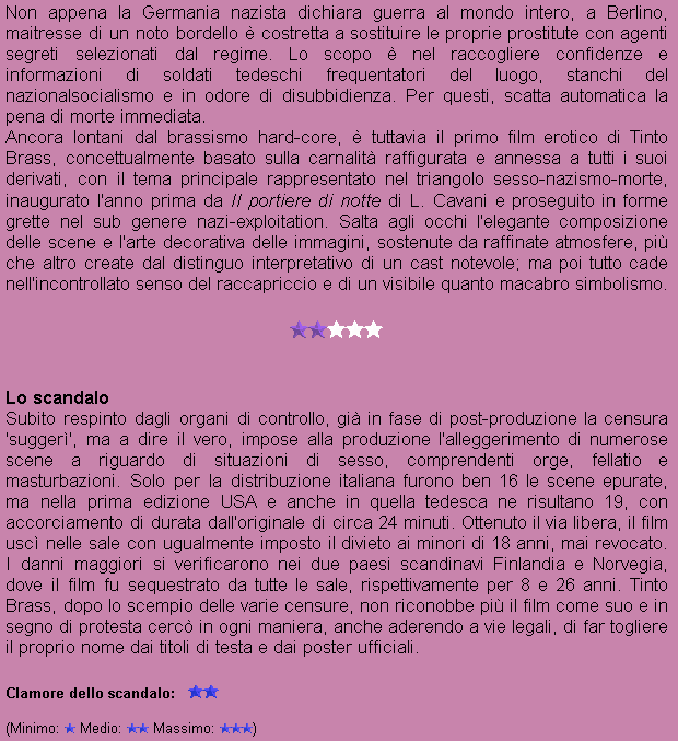 Titolo originale: Salon Kitty Anno: 1975 Nazionalità: ITA - FRA - GER Produzione: Coralta Cinematografica/Seven/Productions Fox Genere: Drammatico Durata: 1 ora e 46 minuti - 1 ora e 50 minuti (Durata orig.: 2 ore e 10 minuti) Divieto: Minori di 18 anni |