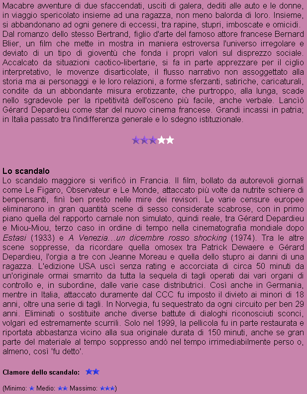 Titolo originale: Les valseuses Anno: 1974 Nazionalità: FRA Produzione: C.A.P.A.C./UPF/S.N. Prodis Genere: Commedia Durata: 1 ora e 47 minuti - 1 ora e 41 minuti (Durata orig:: 2 ore e 30 minuti) Divieto: Minori di 18 anni |