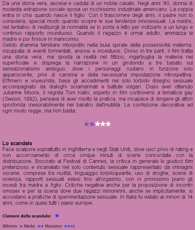 Titolo originale: Savage Grace Anno: 2007 Nazionalità: USA - SPA - FRA Produzione: Montfort/Celluloid Dreams/Killer Films Genere: Drammatico Durata: 1 ora e 43 minuti (Durata orig.: 1 ora e 48 minuti) Divieto: Minori di 14 anni |