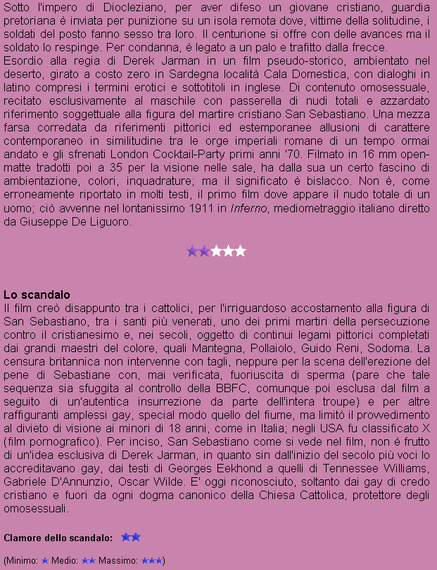 Titolo originale: Sebastiane Anno: 1976 Nazionalità: ING Produzione: Cinegate Ltd./Disctac/Megalovision Genere: Drammatico Durata: 1 ora e 30 minuti Divieto: Minori di 18 anni |