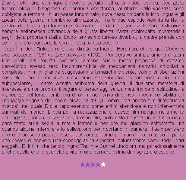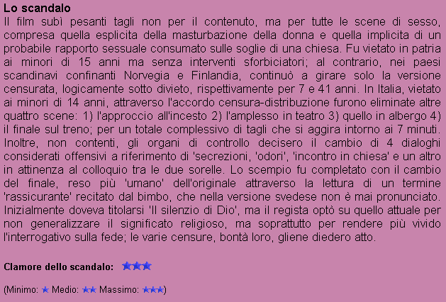 Titolo originale: Tystnaden Anno: 1963 Nazionalità: SVE Produzione: Svensk Filmindustri Genere: Drammatico Durata: 1 ora e 29 minuti (Durata orig.: 1 ora e 36 minuti) Divieto: Minori di 14 anni |