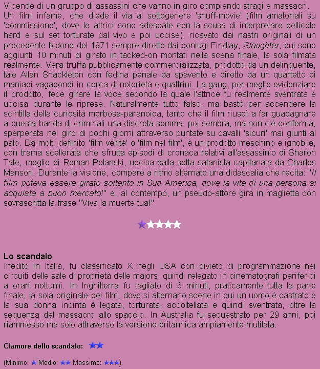 Titolo originale: Snuff Anno: 1976 Nazionalità: ARG - USA - CAN Produzione: August Films/Selected Pictures Genere: Horror Durata: 1 ora e 20 minuti Divieto: Inedito in Italia |