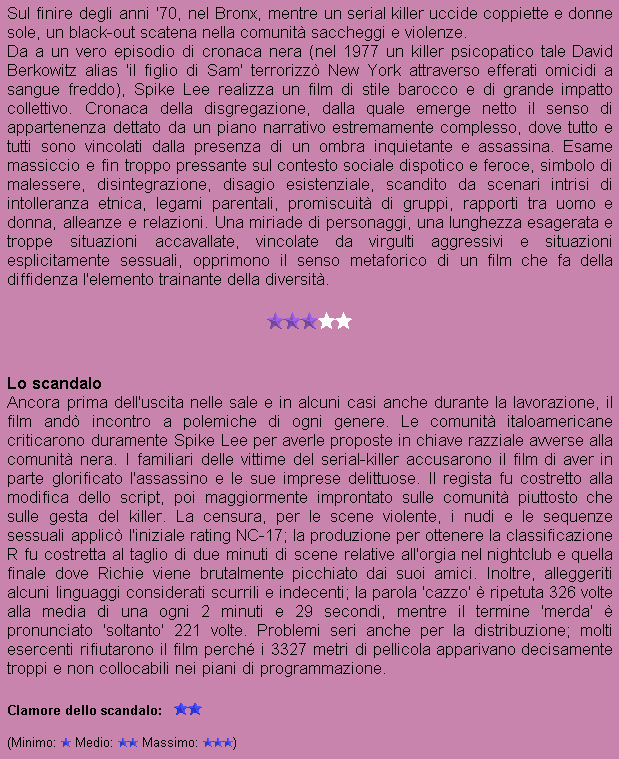 Titolo originale: Summer Of Sam Anno: 1999 Nazionalità: USA Produzione: Touchstone/40 Acres & A Mule Filmworks Genere: Drammatico Durata: 2 ore e 22 minuti (Durata orig.: 2 ore e 24 minuti) Divieto: Minori di 14 anni |