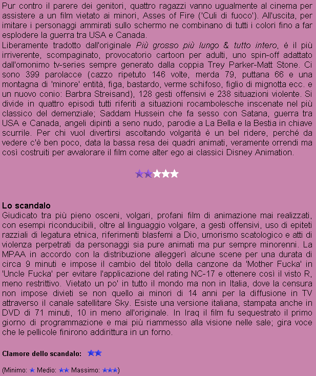 Titolo originale: South Park: Bigger Longer & Uncut Anno: 1999 Nazionalitą: USA Produzione: Paramount Pictures/Warner Bros/Comedy Central Genere: Animazione Durata: 1 ora e 21 minuti Divieto: Film per tutti Premi: Nomination all'Oscar (Canzone: 'Blame Canada') |