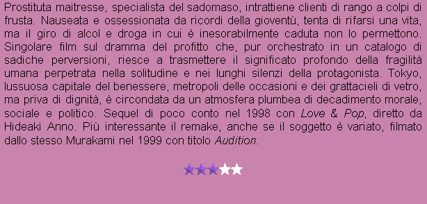 Regia: Ryû Murakami Cast: Miho Nikaido, Sayoko Amano, Tenmei Kano, Kan Mikami, Masahiko Shimada, Yayoi Kusama, Chie Sema Sceneggiatura: Ryû Murakami (dal proprio romanzo) Fotografia: Tadashi Aoki Musica: Ryûichi Sakamoto |