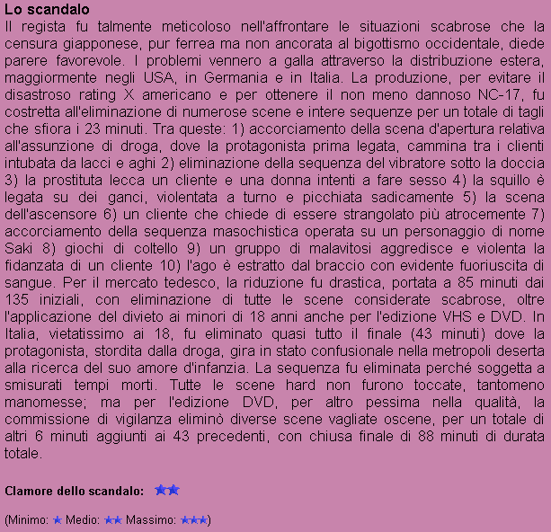 Titolo originale: Topâzu Anno: 1992 Nazionalità: GIA Produzione: Cinemabrain/JVD/Melsat Inc. Genere: Drammatico Durata: 1 ora e 34 minuti (Durata orig.: 2 ore e 15 minuti) Divieto: Minori di 18 anni |