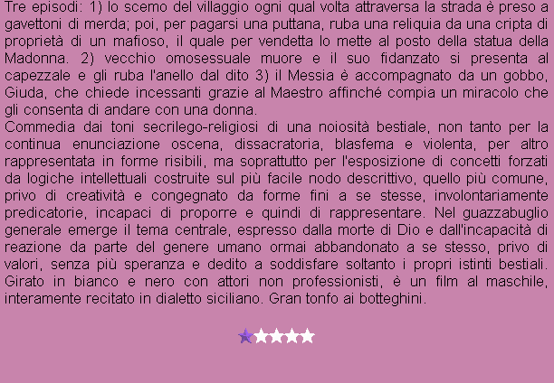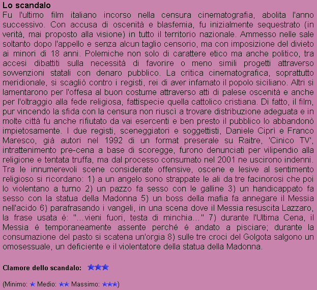Regia: Daniele Ciprì, Franco Maresco Cast: Salvatore Gattuso, Carlo Giordano, Pietro Arcidiacono, Antonino Carollo, Camillo Conti, Marcello Miranda, Baldassarre Catanzaro, Fortunato Cirrincione, Giuseppe Pepe Sceneggiatura: Daniele Ciprì, Franco Maresco, Lillo Iacolino (dal soggetto di Daniele Ciprì, e Franco Maresco) Fotografia: Luca Bigazzi Musica: Luigi Melchionda |