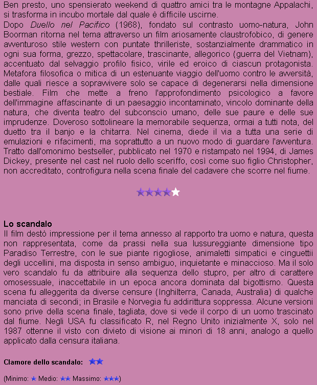 Regia: John Boorman Cast: Jon Voight, Burt Reynolds, Ned Beatty, Ronny Cox, Ed Ramey, Billy Redden, Seamon Glass, Randall Deal, Bill McKinney, Herbert Coward, James Dickey Sceneggiatura: James Dickey (dal proprio romanzo) Fotografia: Vilmos Zsigmond Musica: Eric Weissberg |