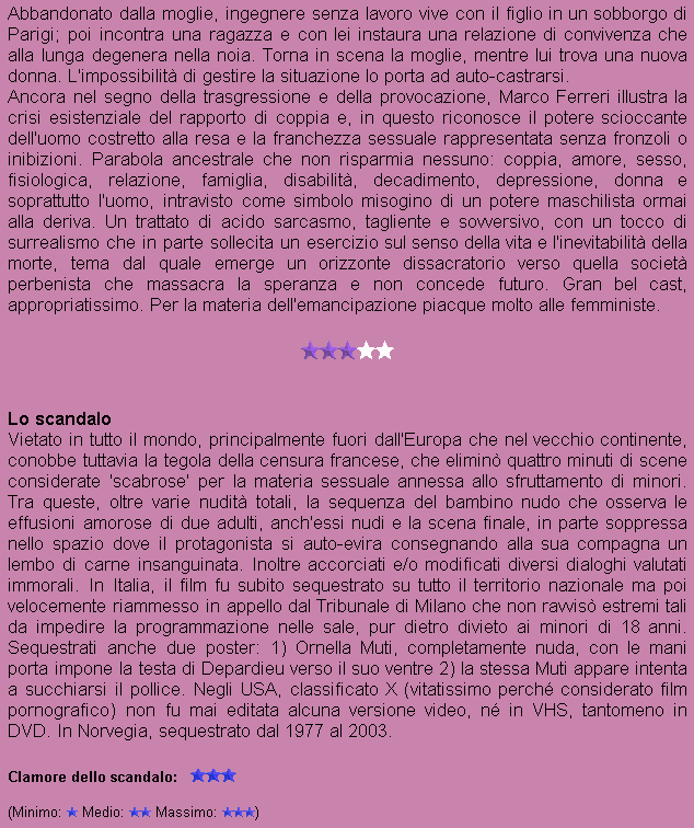 Regia: Marco Ferreri Cast: Gérard Depardieu, Ornella Muti, Michel Piccoli, Renato Salvatori, CastZouzou Shore, Nathalie Baye, Benjamin Labonnelie Sceneggiatura: Marco Ferreri, Rafael Azcona, Dante Matelli (dal soggetto di Marco Ferreri) Fotografia: Luciano Tovoli Musica: Philippe Sarde |
