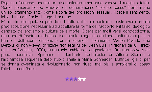 Regia: Bernardo Bertolucci Cast: Marlon Brando, Maria Schneider, Maria Michi, Giovanna Galletti, Gitt Magrini, Catherine Allégret, Luce Marquand, Marie-Hélène Breillat Sceneggiatura: Bernardo Bertolucci, Franco Arcalli (dal soggetto di Bernardo Bertolucci) Fotografia: Vittorio Storaro Musica: Gato Barbieri |
