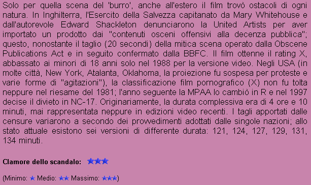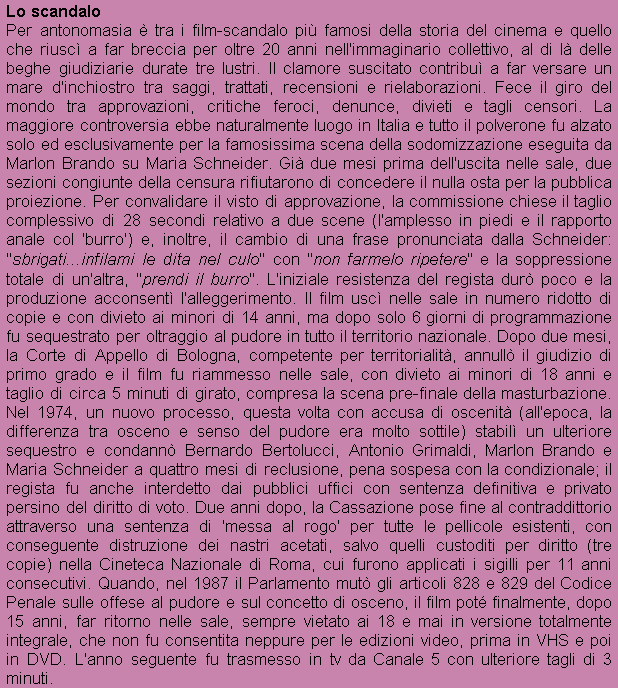 Titolo originale: Ultimo tango a Parigi Anno: 1972 Nazionalità: ITA - FRA Produzione: PEA/Artistes Associés Genere: Drammatico Durata: 2 ore e 11 minuti (Durata orig.: 2 ore e 16 minuti - Integrale 1972: 2 ore e 29 minuti - Original Cut: 4 ore e 10 minuti) Divieto: Minori di 18 anni (Divieto iniz.: minori di 14 anni) Premi: Nomination all'Oscar (Regia - Attore: Marlon Brando) David di Donatello (Maria Schneider: premio speciale della giuria) Nastro d'Argento (Premio alla regia) |