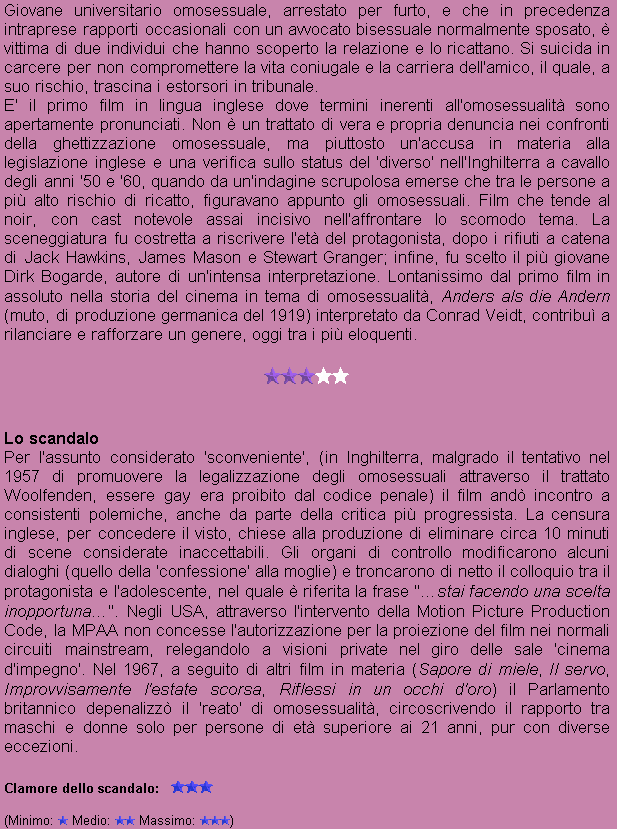 Titolo originale: Victim Anno: 1961 Nazionalità: ING Produzione: Allied Film Makers Genere: Drammatico Durata: 1 ora e 30 minuti (Durata orig.: 1 ora e 40 minuti) Divieto: Minori di 14 anni Premi: Festival di Venezia (Film: Nomination al Leone d'Oro) Bafta (ING) (Dirk Bogarde: nomination attore - Nomination alla sceneggiatura) |