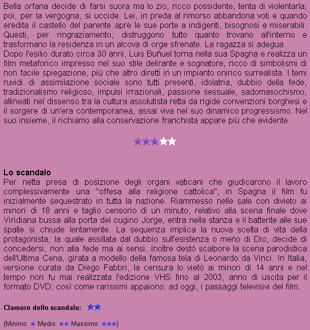 Titolo originale: Viridiana Anno: 1961 Nazionalità: SPA - MES Produzione: UNINCI/Films 59 Genere: Drammatico Durata: 1 ora e 30 minuti (Durata orig.: 1 ora e 31 minuti) Divieto: Minori di 18 anni Premi: Festival di Cannes (Film: Palma d'Oro) |