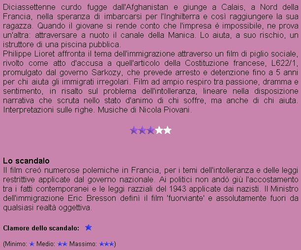 Regia: Philippe Lioret Cast: Vincent Lindon, Firat Ayverdi, Audrey Dana, Derya Ayverdi, Thierry Godard, Selim Akgul, Firat Celik, Murat Subasi, Behi Djanati Atai Sceneggiatura: Philippe Lioret, Emmanuel Courcol, Olivier Adam, Serge Frydman Fotografia: Laurent Dailland Musica: Nicola Piovani |